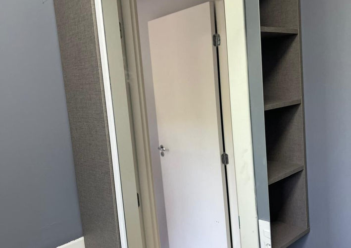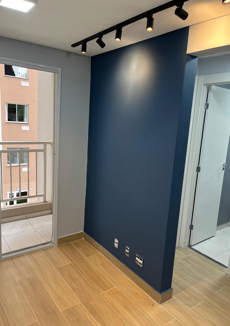 Apartamento de aluguel, planejado para baixo custo e máxima funcionalidade. A marcenaria sob medida aproveita cada centímetro, e a seleção de cores segue o gosto do cliente, com tons escuros formando imagens geométricas na parede que chamam atenção e criam a ilusão de um espaço maior.