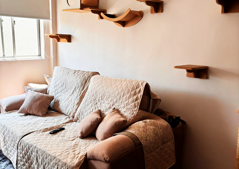 Criamos um ambiente de interiores em um apartamento de aluguel pensado na companhia de gatos. Considerando a necessidade de minimizar custos e preservar o imóvel, optamos por soluções de menor custo, duráveis e fáceis de serem montadas e desmontadas para caso nossos clientes optassem por mudar de apartamento possam levar consigo. O design prioriza espaços funcionais e divertidos para os gatos interagirem, mantendo um estilo acolhedor e amadeirado que o casal procurava. O resultado é um lar onde gatos e donos podem viver momentos de alegria e conexão, sem comprometer a integridade do apartamento alugado.